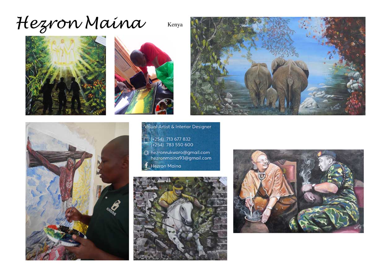 Hezron Maina is a self-taught artist, he has been in the Art field now for three years ( up to 2019). He has not done art at school except had some elementary introductions to it. After his secondary education, he did a Heavy equipment operation course, but his heart drifted back to art. Nowadays he works as a visual artist and an interior designer.